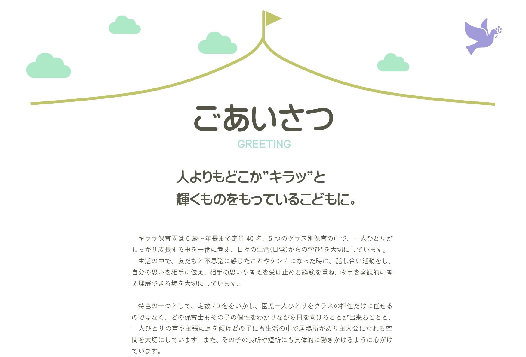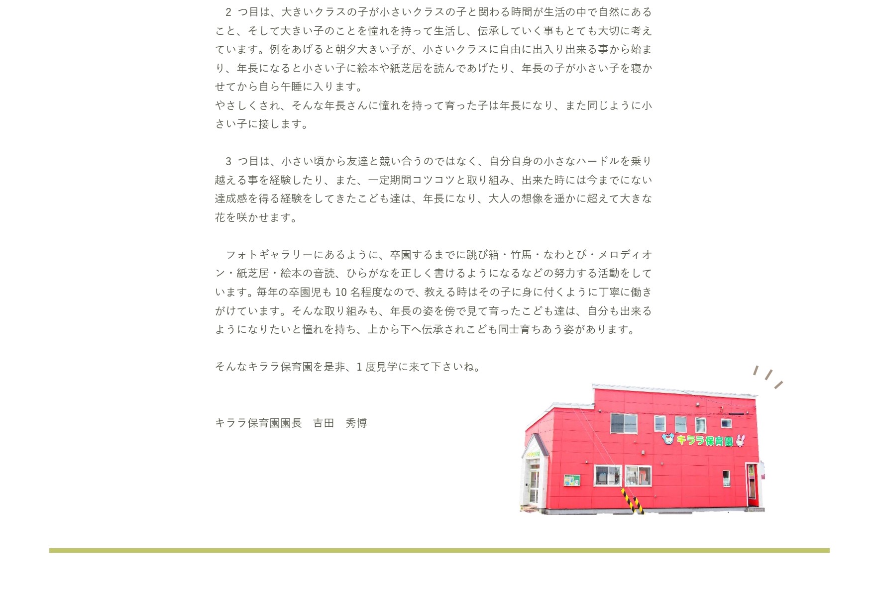 | 沿 革 | 2003年 3月 キララ保育園を設立 定員30名 2005年 4月 定員40名 増員 2006年 9月 新園舎改築 2007年 4月 定員50名 増員 2007年 7月 旭川市認可外保育施設 補助対象施設 2015年 10月 一般社団法人フレ・ウィングステージ設立 2016年 4月 一般社団法人フレ・ウィングステージ キララ保育園として認可 2017年 4月 定員36名から40名 増員 |